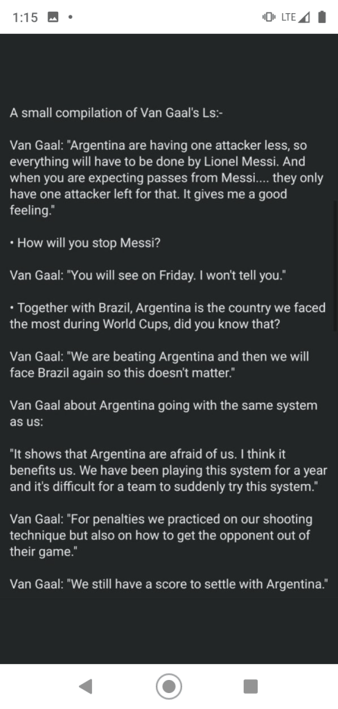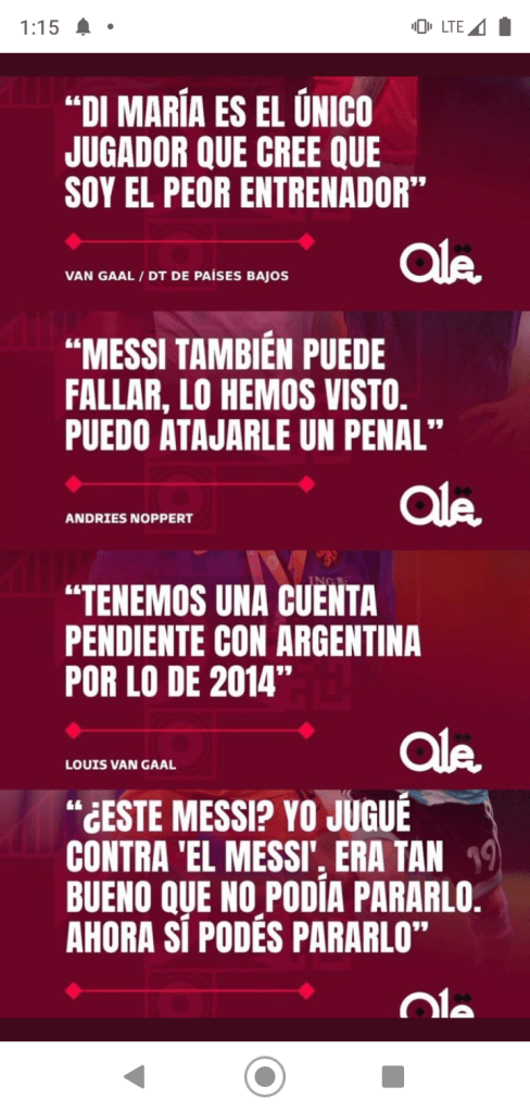 En las fotos adjuntas pueden leer todo lo que dijeron en la previa y tambien todo lo que hicieron los jugadores de Paises Bajos durante la ejecucion de los penales. Pero al final del dia, todos se quedaron con la imagen del festejo de los jugadores de Argentina.