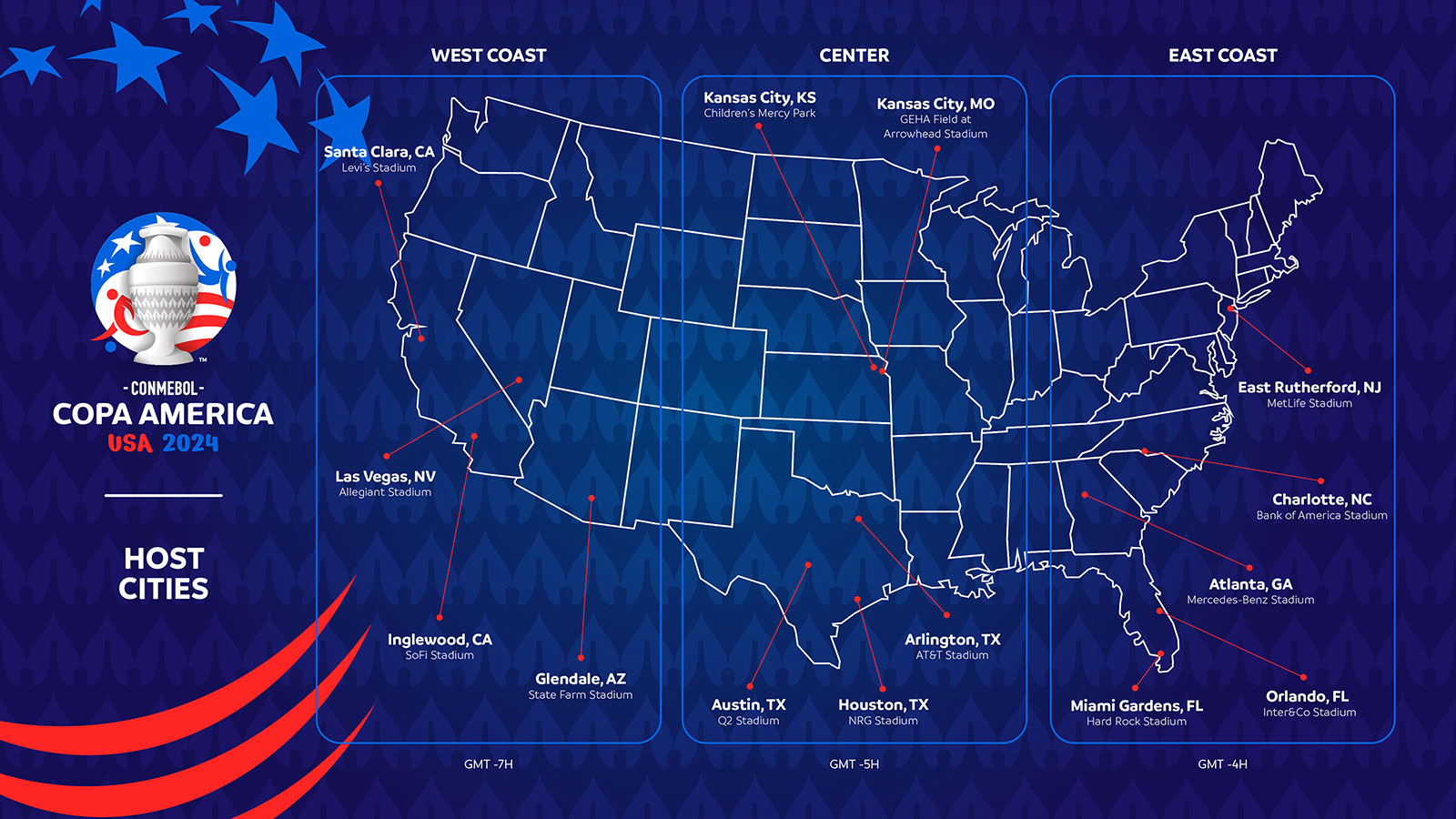 Se empiezan a ultimar los detalles de cara a la Copa América Estados Unidos 2024. Se jugará entre el 20 de Junio al 14 de Julio. El partido inaugural será entre Argentina- Canadá en Atlanta mientras que la Final se disputará en Miami.