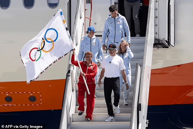 Karen Bass (de rojo) es la Alcaldesa de Los Ángeles y a su lado está Casey Wasserman, el Jefe de la organización de estos Juegos.